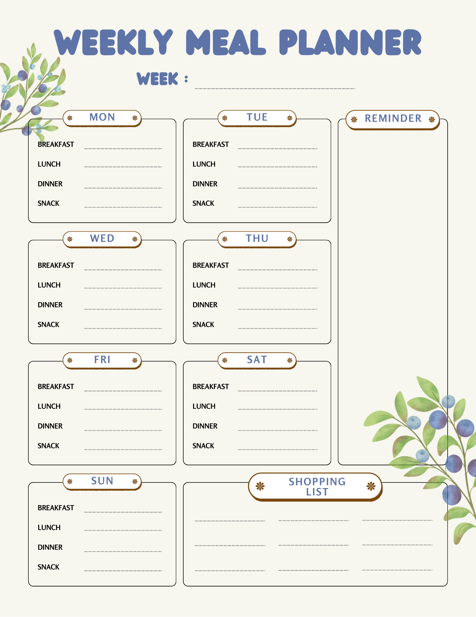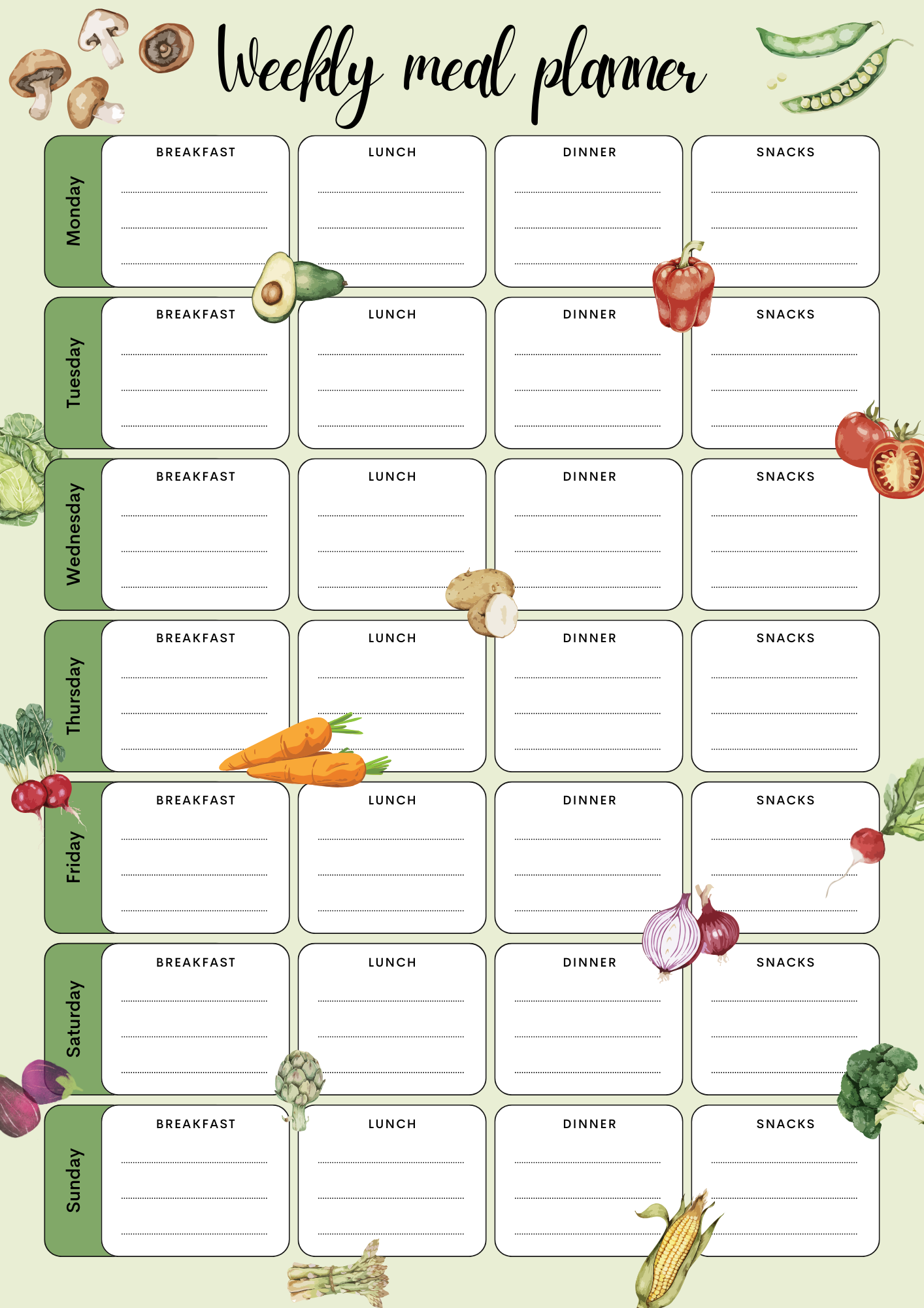 ✅ Weekly layouts – clear spaces for breakfast, lunch, dinner, and snacks
